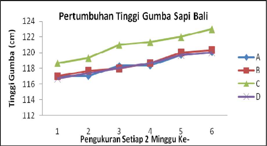 lebih tinggi dari pada sapi yang mendapat perlakuan A, masing-masing 3,33 cm, 4,33 cm, 3,33 cm (Tabel 3.1). Pertambahan tinggi gumba sapi bali pada semua perlakuan secara statistik berbeda tidak nyata (P>0,05) (gambar 3.4).
