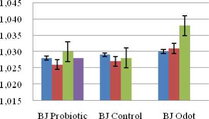 Uji BJ dan alkohol 70% v/v adalah syarat utama dari beberapa syarat yang ditetapkan pemerintah Indonesia dalam SNI 3141.1:2011 untuk penentuan kualitas susu yang dihasilkan oleh para peternak khususnya sapi perah skala kecil untuk dapat diterima oleh pabrik industri susu di Indonesia. BJ susu kambing yang dipelihara oleh peternak skala kecil di Kecamatan Busungbiu secara umum menunjukkan 1.0295 ± 0.0011 dengan semua uji alkohol 70% v/v negatif. Namun pemberian tambahan pada campuran probiotik dengan air minum (TrP) BJ nya 1.0280 ± 0.0010 adalah nyata lebih kecil (P<0.05) dibanding dengan pemberian tambahan silase odot (TrO) 1.0330 ± 0.0020 dan BJ susu kambing yang hanya mendapatkan hijauan 5 kg/ekor/hari (TrC) (Tabel 1 dan Grafik 1). Hal ini menunjukkan bahwa BJ susu kambing yang dipelihara di Busungbiu lebih tinggi dari syarat minum 1.0270 berdasarkan SNI 3141.1:2011 dan berkualitas baik berdasarkan hasil negatif pada uji alkohol 70% v/v.