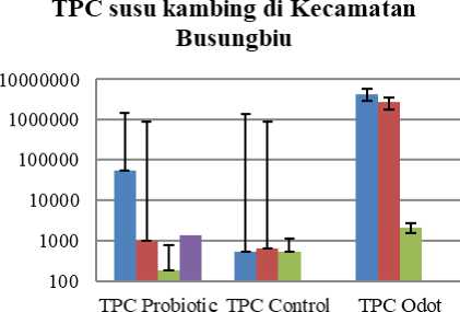 TPC susu kambing yang dipelihara oleh peternak skala kecil di Kecamatan Busungbiu adalah 706,000 ± 480,700 CFU/ml adalah di bawah batas maximum 1x106 CFU/ml yang direkomendasikan oleh SNI 3141.1:2011. Hasil ini juga sangat kecil dibandingkan dengan 7,4±2,9 x 105 CFU/ml pada susu sapi segar di Kecamatan Probolinggo hasil penelitian Cahyono et al. (2013). Namun kambing yang diberi tambahan silase odot sebanyak 10% dari hijauan meningkatkan TPC 2,334,000 ± 670,400 CFU/ml (TrO) adalah nyata lebih besar dari TPC TrP 14,400 ± 580,600 CFU/ml maupun TPC TrC 580 ± 670,400 CFU/ml (P<0.05) (Tabel 1 dan Grafik 1). Hanya TPC TrO yang melebihi batas maksimal SNI 3141.1:2011. Hal ini menggambarkan bahwa tatalaksana pemerahan oleh peternak yang memberikan silase odot pada kambingnya kurang terjaga kebersihan dan hiegine peralatan dan lingkungan pemerahan. Hal ini didukung oleh Oliver et al. (2009) dan Nada et al. (2012) yang mengatakan bahwa kebersihan dan hiegiene yang berhubungan dengan produksi susu sangat penting dalam produksi pangan yang berkualitas tinggi sekaligus mencegah penyebaran penyakit yang berasal dari susu yang mengadung mikroorganisme yang tinggi terutama penyakit mastitis atau penyakit inflamasi kelenjar mammary (Correa et al. 2010).
