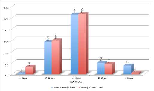 Briefly, respondents for both groups are dominant aged between 26 and less than 45 years, that accounts 52.9 percent and 53.2 percent for foreign and domestic tourists, respectively. The complete distribution of respondents’ age is shown in Fig. 2.