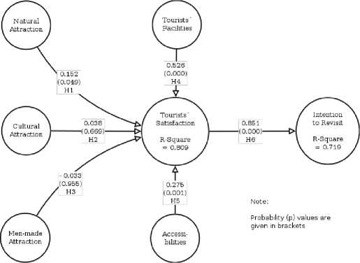 Refers to Chin [14], the R2-value of the endogenous construct can be used to evaluate construct’s quality. Threshold values as much as 0.19, 0.33, and 0.67 is needed to declare respective endogenous construct has weak, moderate, or substantial quality. Refers to these criteria, tourists’ satisfaction