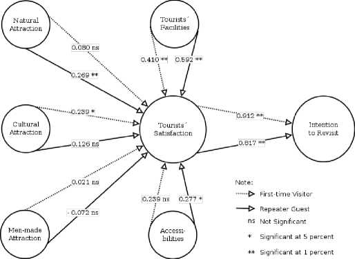 For the causal relationship between tourists’ satisfaction with their intention to revisit the destination, the effect of satisfaction is significant (see Fig. 4 and Fig. 5). However, if path coefficients for first-time and repeater guests were compared, tourists’ satisfaction has a bigger effect on intention to revisit for first-time visitors (path = 0.912) than for repeater guests (path = 0.817) although both values are significant.