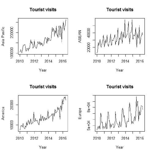 This research uses foreign tourist visits from four major countries: Asia Pacific, ASEAN, America (including Canada and Latin America), and Europe during the period from January 2010 to June 2016. The plot of the visits for the four countries can be seen in Figure 1.