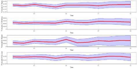 The forecasts for foreign tourist visits can be seen in Table 1. The plot of the forecasts and the credible interval can be seen in Figure 2.