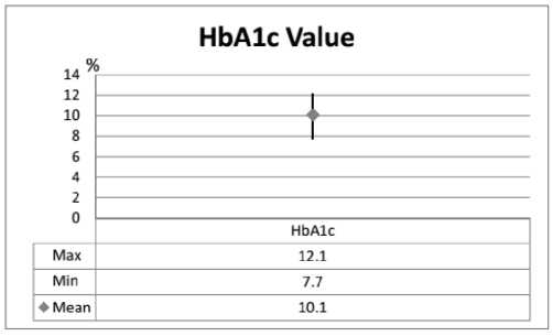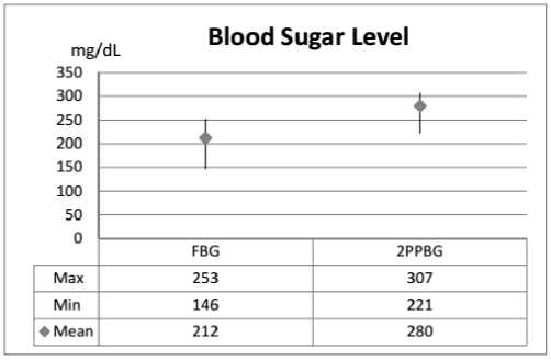 43 patients met the inclusion and exclusion criteria and became the research subject. Table 1 shows patient's age and gender as a demographics data. The results showed that T2DM outpatient who more dominant were male (72.09%) and aged <65 years (90.70%). The mean FBG level of the patient was 212 mg / dL while the mean 2PPBG level of the patient was 280 mg./dL (Figure 1). The mean HbA1c value of the patient was 10.1% (Figure 2)